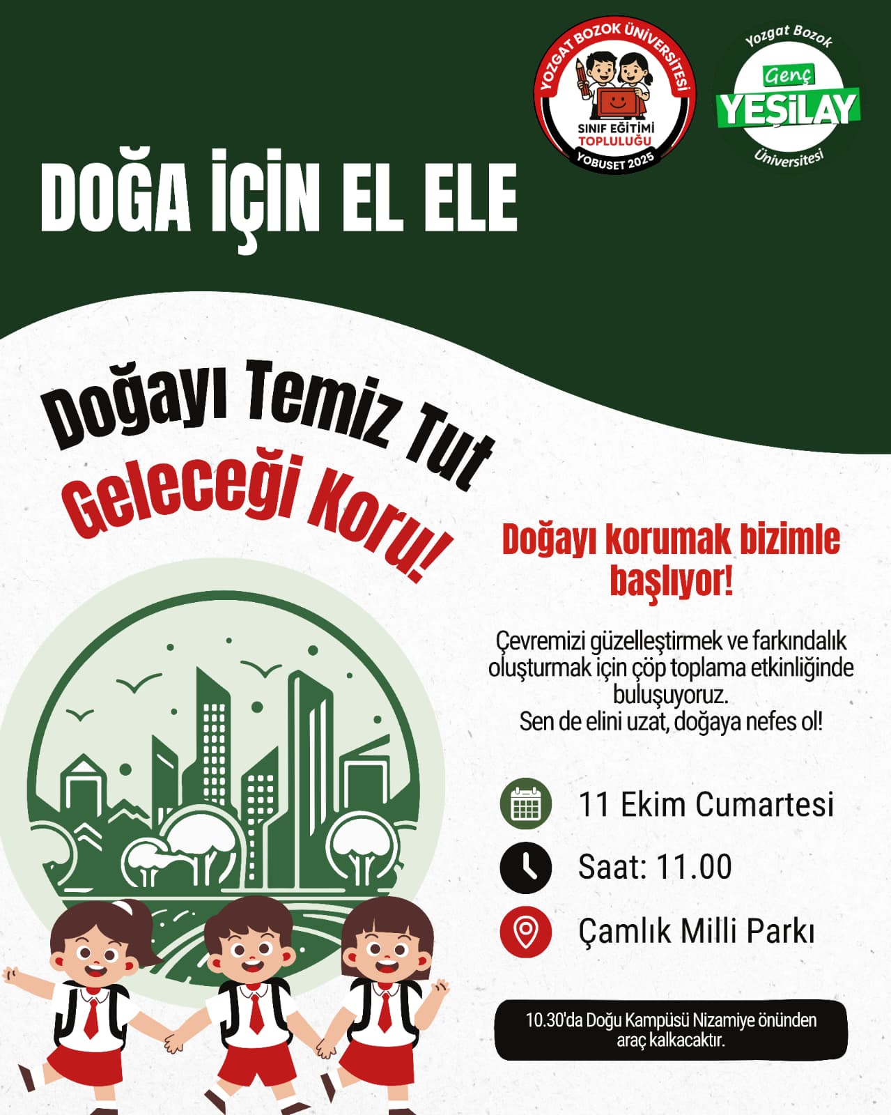 11 Ekim Cumartesi günü saat 11.00' de Sınıf Eğitimi Topluluğu ve Genç Yeşilay Topluğu ortaklığında Türkiye'nin ilk milli parkı olan Yozgat Çamlık Milli Parkı'nda "Doğa İçin El Ele etkinliği" gerçekleştirilecektir. Etkinliğimize tüm üyelerimiz davetlidir.🌱💚