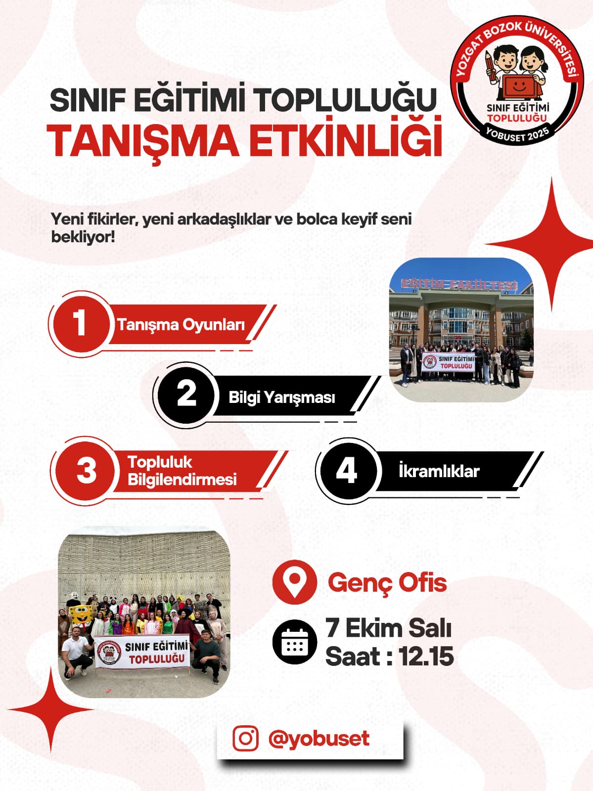 Yozgat Bozok Üniversitesi Sınıf Eğitimi Topluluğu olarak Sınıf Öğretmenliği 1. Sınıfta olan arkadaşlarımızla tanışma etkinliği düzenliyoruz 😊✨