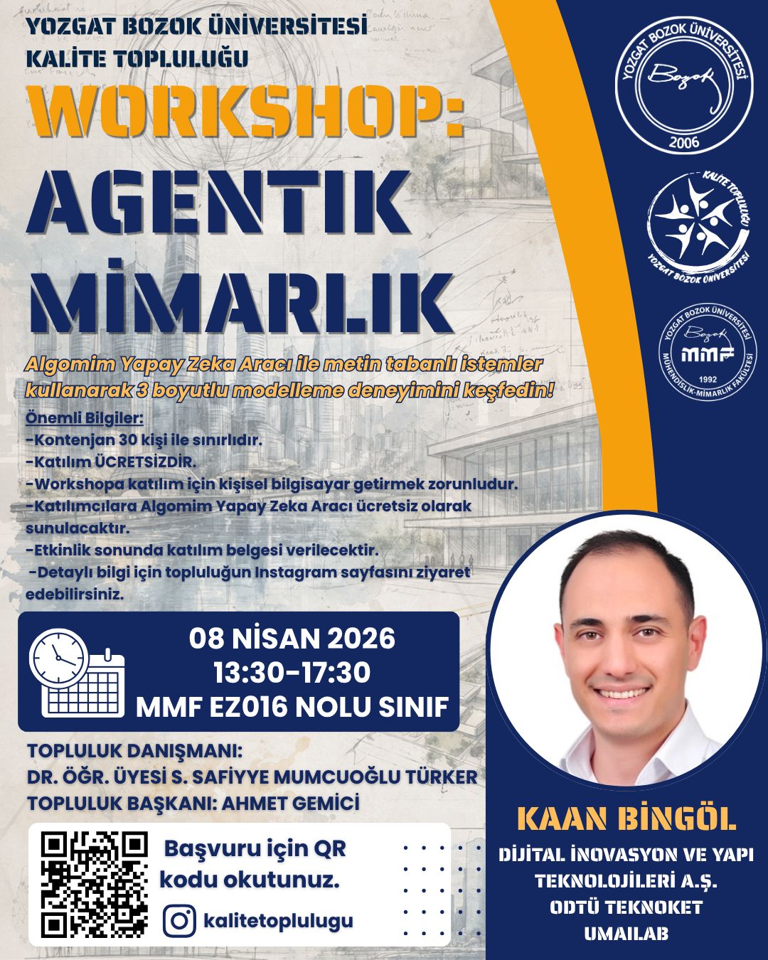 Yozgat Bozok Üniversitesi Kalite Topluluğu olarak düzenlediğimiz workshop serimizin bu etkinliğinde, “Agentik Mimarlık” konusu ele alınacaktır. Katılımcılar, Algomim Yapay Zekâ aracı ile metin tabanlı istemler kullanarak 3 boyutlu modelleme deneyimini keşfetme fırsatı bulacaktır.