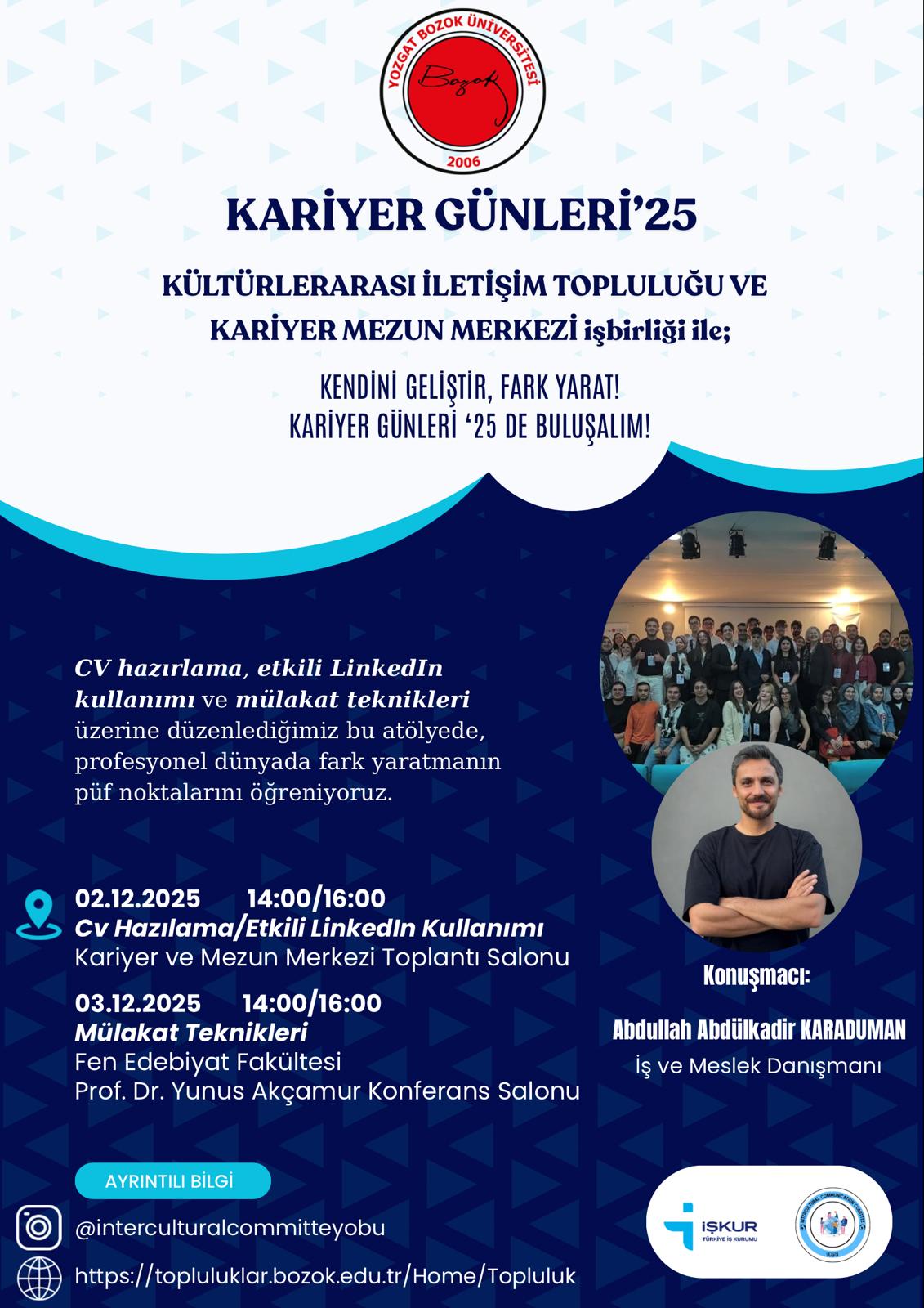 Kültürlerarası İletişim Topluluğu ve Kariyer Mezun Merkezi iş birliğiyle düzenlenen Kariyer Günleri ’25, öğrencilerin profesyonel dünyaya hazırlanmasına destek olmayı amaçlayan kapsamlı bir gelişim programı olarak sizlerle buluşuyor.